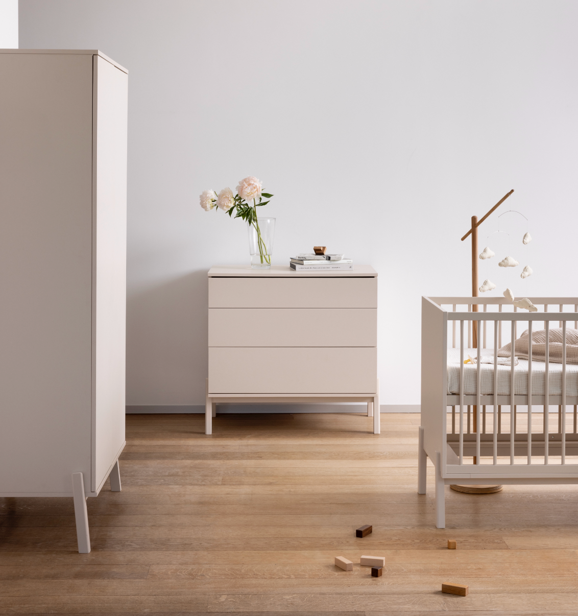 Wprowadź do pokoiku dziecka spokojny, minimalistyczny styl dzięki komodzie Quax Ashi w kolorze Clay - eleganckiej komodzie z cichymi szufladami otwieranymi naciskiem, idealnej do łatwego i relaksującego przechowywania w dziecięcej przestrzeni.