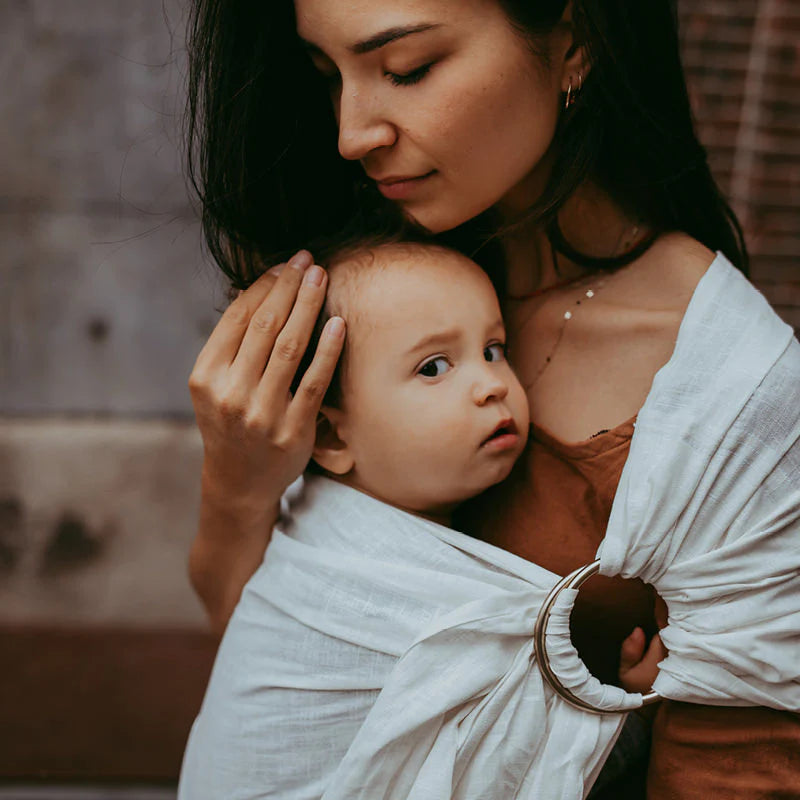 Moon ringsling är det snabbaste och enklaste sättet att bära ditt barn — inga spännen, inga komplicerade knytningar. Med lite övning kan du snabbt och säkert placera ditt barn på några sekunder. Det 100 % linne ger mjukt, stadigt stöd åt ditt barn.
