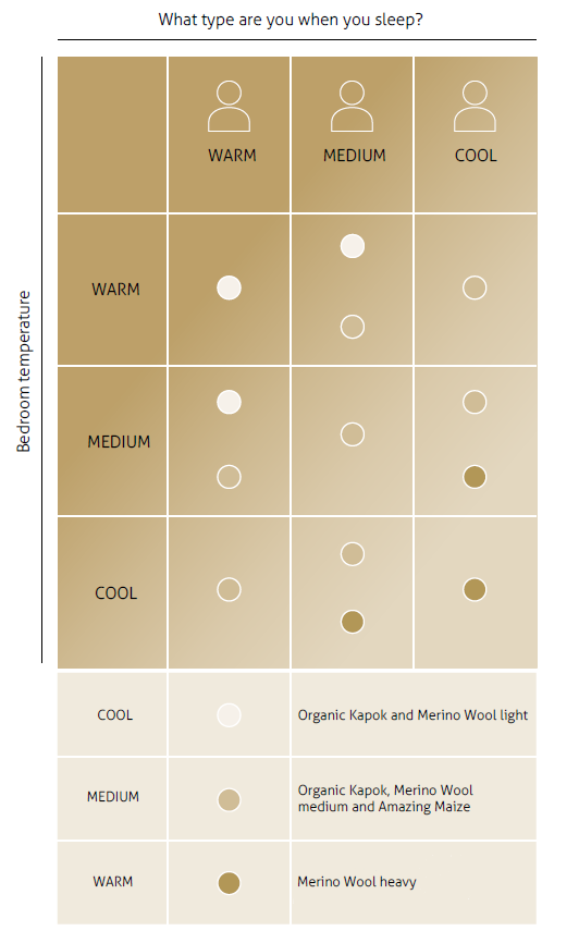 • Sıcaklık: dört mevsim kullanım için orta; serin, orta veya sıcak ısı sınıfları arasından seçim yapabilirsiniz.