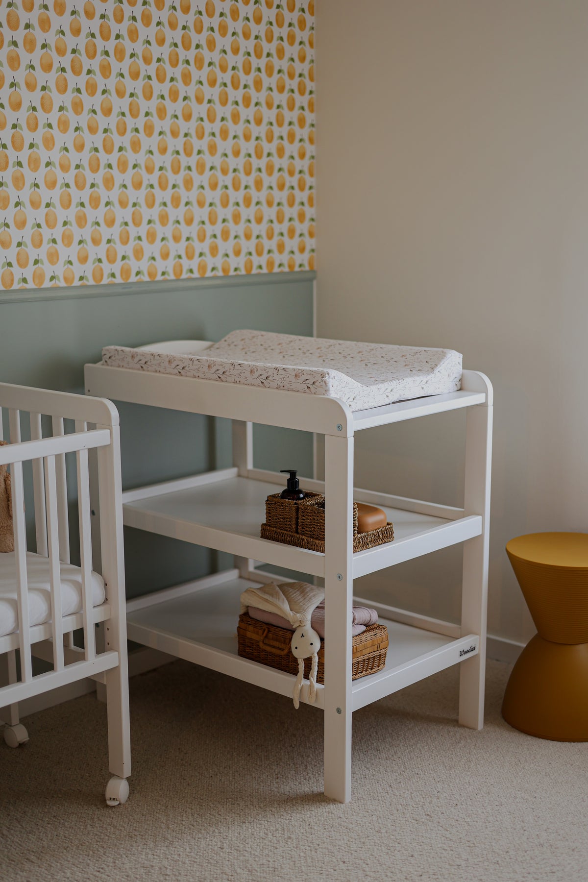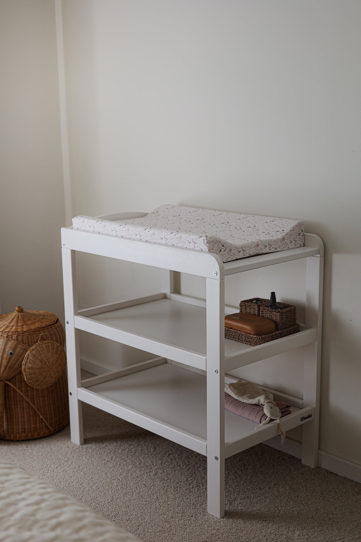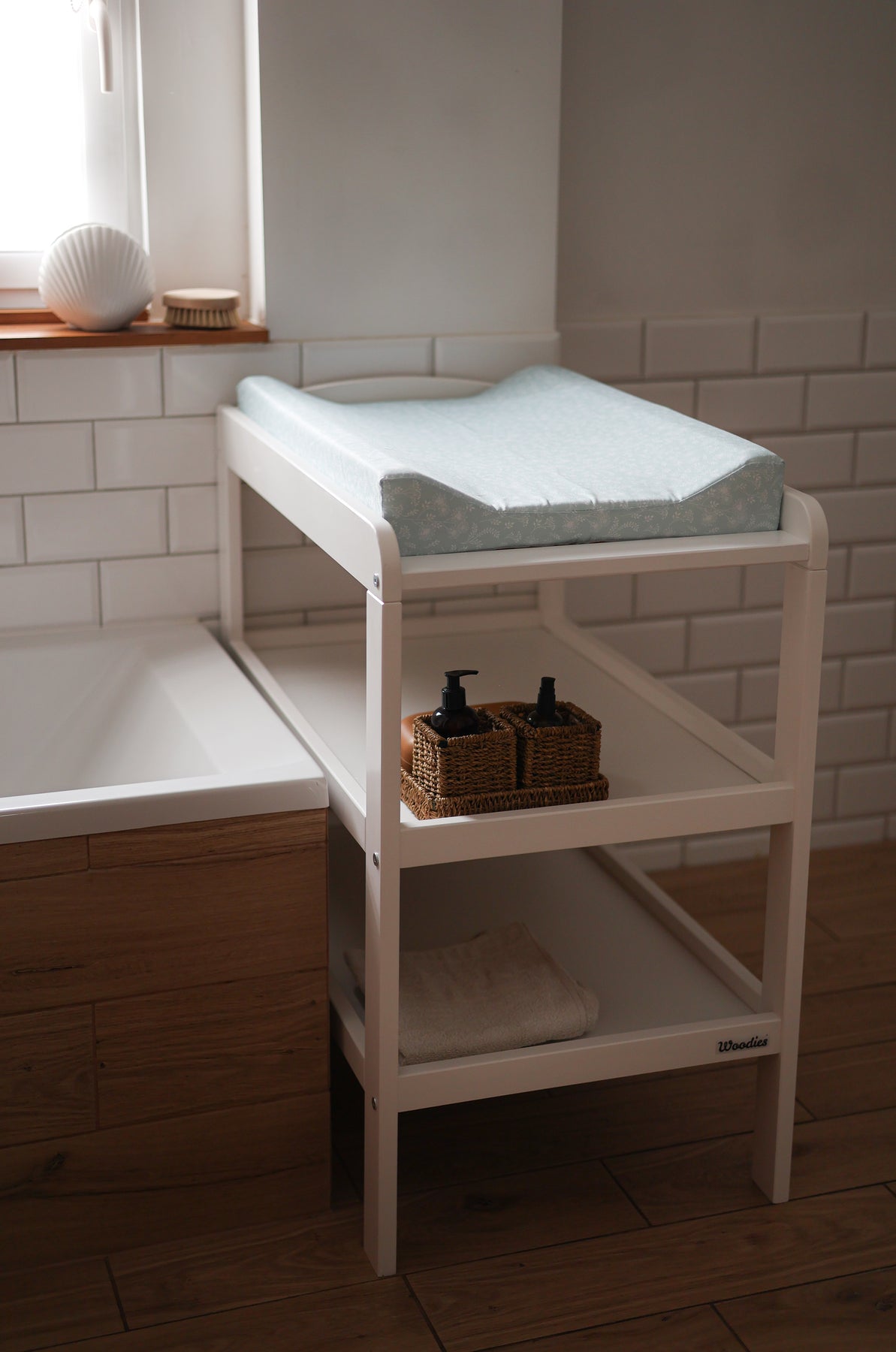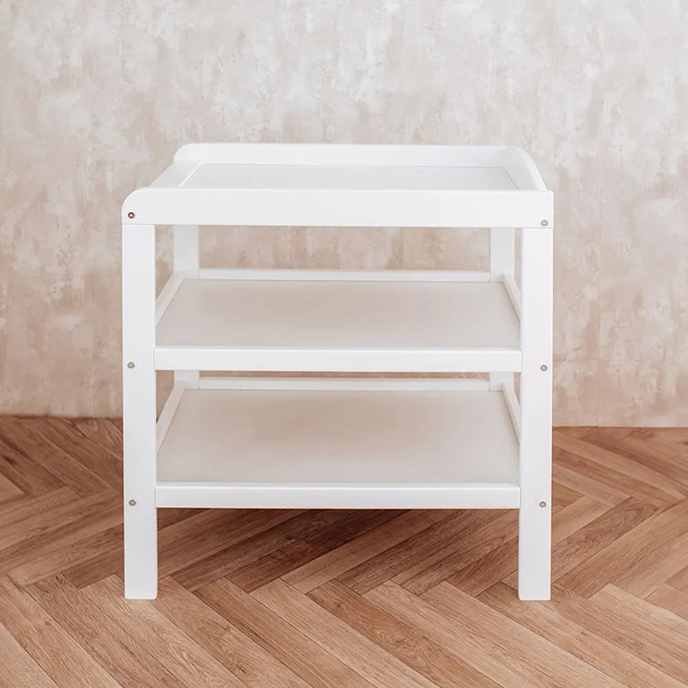 Bu bağımsız beyaz bebek alt değiştirme masasıyla her bez değişimini daha sakin ve sırtınıza daha nazik hale getirin. Ergonomik yüksekliği ve açık rafları, ıslak mendil ve bezleri kolay ulaşım sağlar, evinize zamansız, bebek odasına uygun bir görünüm katar.
