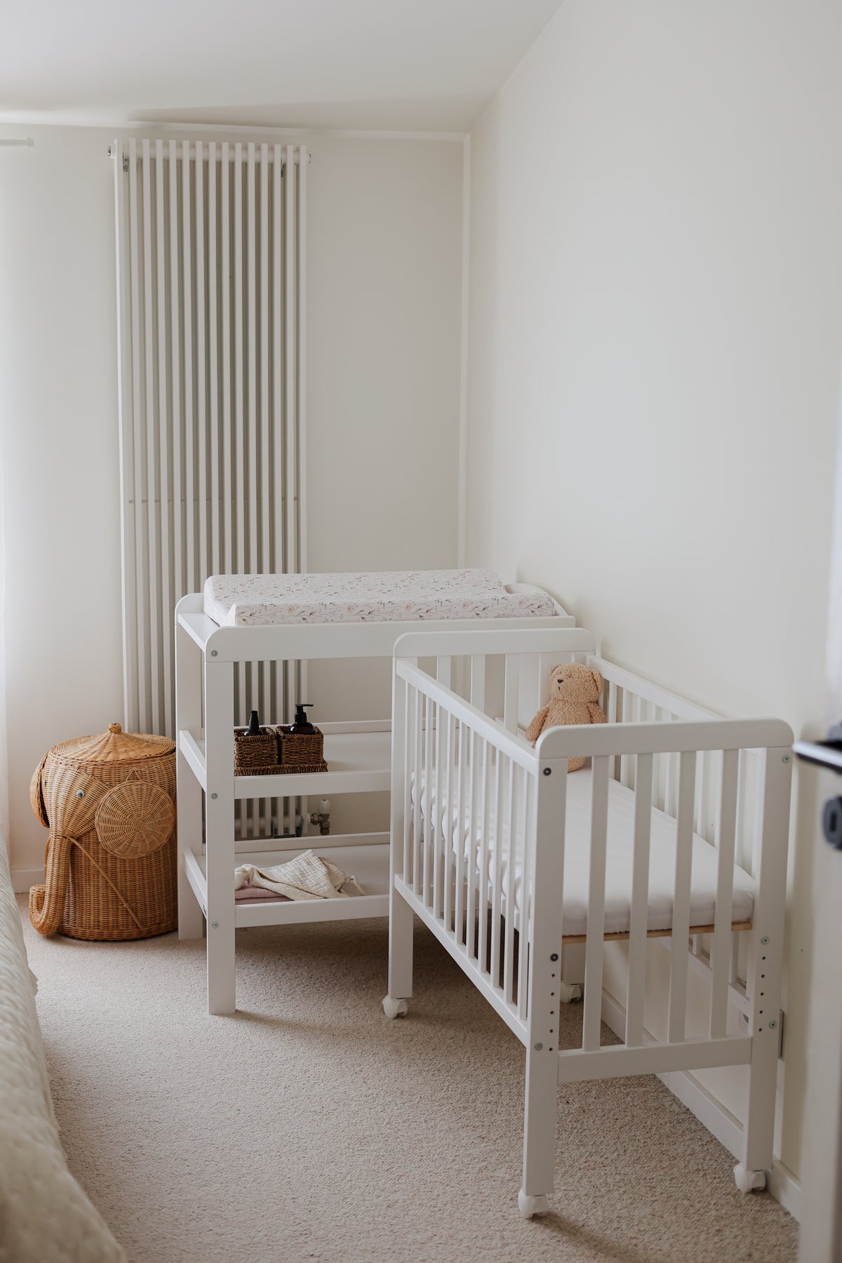 - Çoğu bebek odası stiline uyum sağlayan temiz, modern beyaz kaplama.